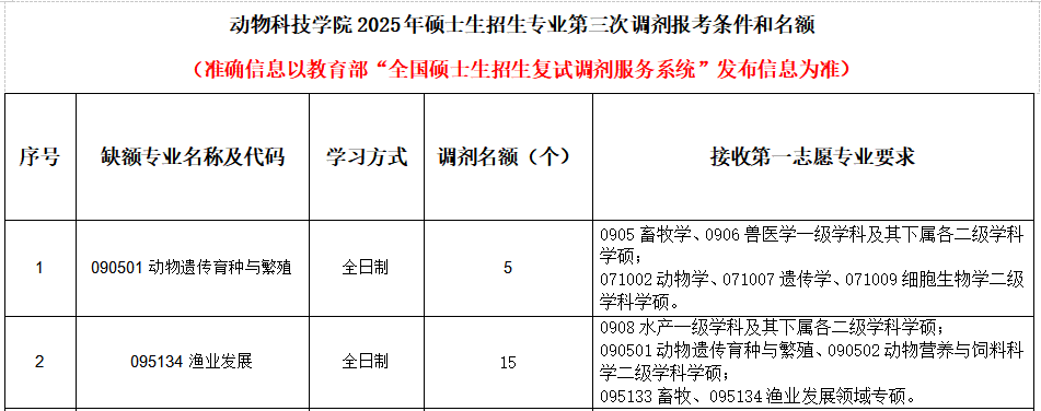 各位考生:公司动物遗传育种与繁殖学硕、渔业发展专硕调剂系统第三次开放时间为2025年4月15日12时,系统关闭时间根据生源情况确定,欢迎全国各地优秀考生调剂到公司继续深造。yl1111永利集团2025年4月15日
