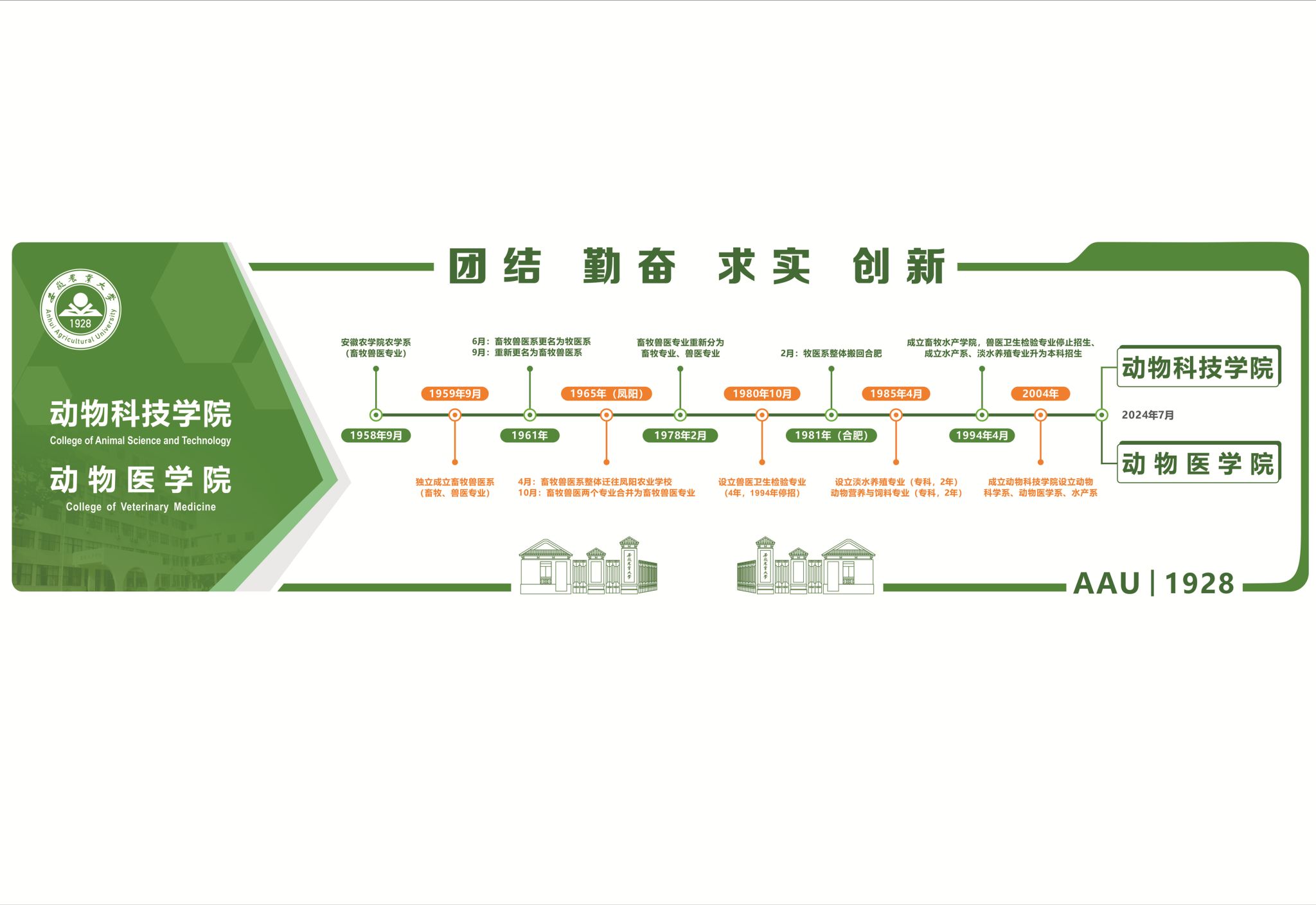 yl1111永利集团溯于1958年9月安徽农学院农学系设立的畜牧兽医专业,并于当年招收兽医专业员工。1959年9月经当时省委批准,独立成立畜牧兽医系,下设畜牧、兽医两个专业,并当年招收畜牧专业员工。1961年6月经当时省委农村工作部批复,畜牧兽医系更名为牧医系;9月,经当时省教育厅调整,重新更名为畜牧兽医系。在此期间,畜牧兽医系师生先后于1958年到安徽桐城舌河公社参加“拜农民为师”运动、1964年到安徽寿县三觉区余积公社参加“四清”运动。1965年4月,畜牧兽医系整体迁往凤阳与凤阳农业学校合并;10月,根据当时省农业厅的要求,畜牧专业和兽医专业合并为畜牧兽医一个专业;1978年2月,经当时省教育局同意,畜牧兽医专业又重新分设畜牧、兽医两个专业。1980年10月,经省高教局同意设立兽医卫生检验专业并当年招生,学制4年。1981年2月,牧医系从凤阳迁回合肥。1985年4月,经省教育厅批准,设立淡水养殖专业(专科,2年)、动物营养与饲料(专科,2年)并当年招生。1994年4月,经省教委同意,成立畜牧水产学院,兽医卫生检验专业(专科)停止招生,成立水产系,同时淡水养殖专业升为本科招生。1995年5月,经学校同意,畜牧水产学院成立动物科学系、动物医学系和水产系三个系。2004年畜牧水产学院更名为yl1111永利集团。2024年7月,动物医学系独立建院。